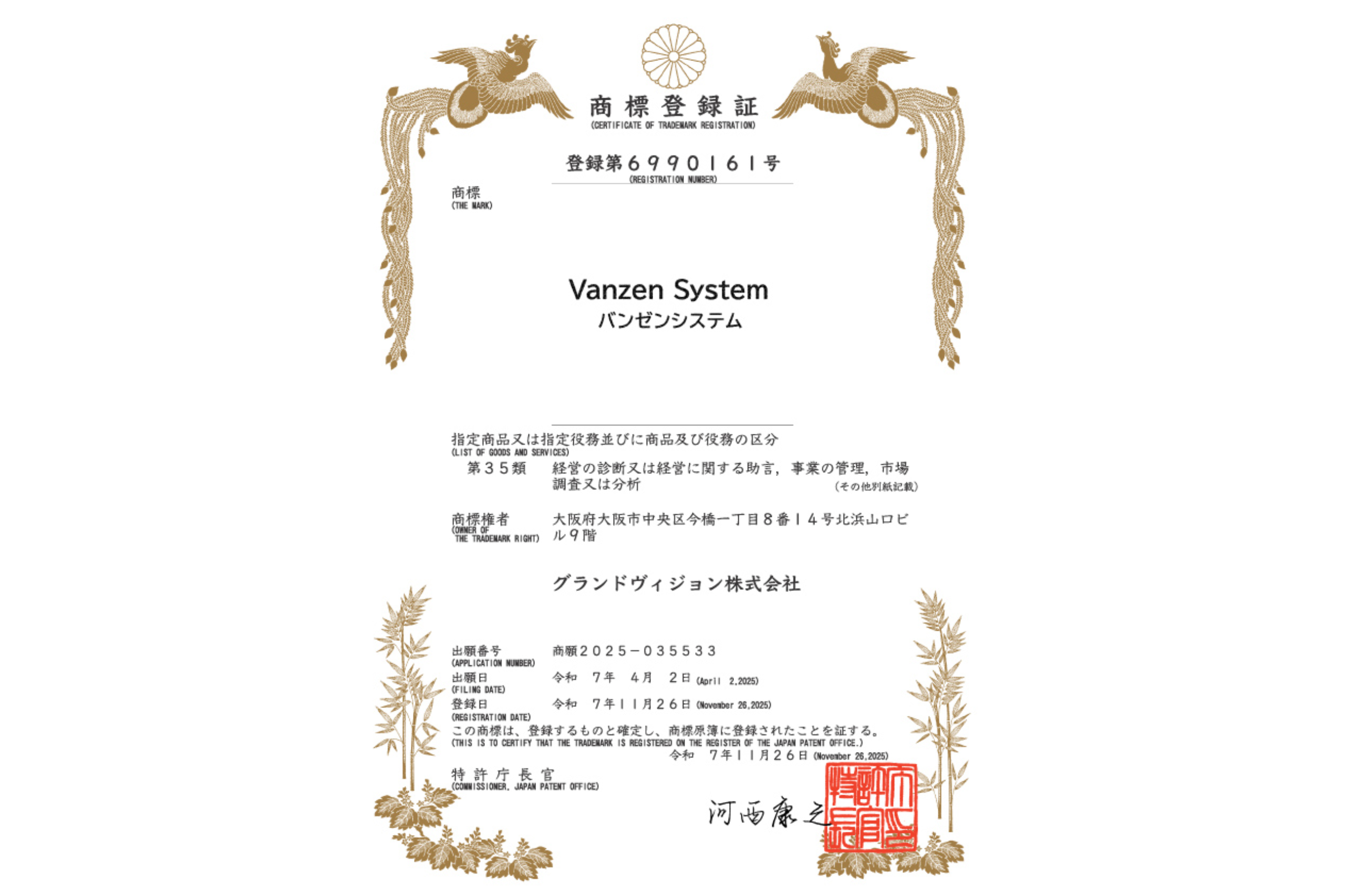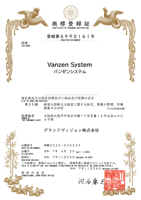 私たちグランドヴィジョンが、お客様のために提供させていただく、ライフプラン策定のための、万全なサポートシステム、「バンゼンシステム・Vanzen System」が、その独自性あるブランド価値を認められ、特許庁で商標登録が受理されました。